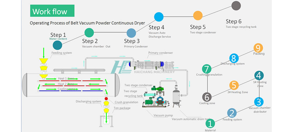 Vacuum Belt Continuous Dryer For Powder is a kind of high efficiency conducting type continuous drying equipment. Its unique structure and working principle determines that it has the characteristics of high thermal efficiency, low energy consumption, convenient operation and control, good operating environment and good drying product.